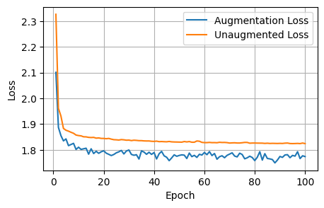 plot_metrics(aug_losses, unaug_losses, 'Loss')