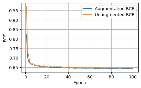 plot_metrics(aug_bces, unaug_bces, 'BCE')