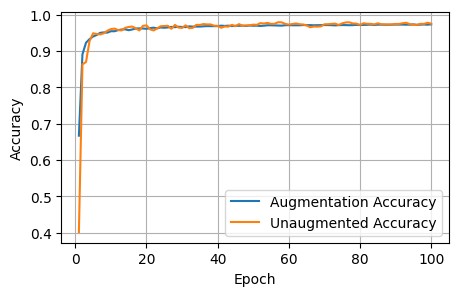 plot_metrics(aug_accuracies, unaug_accuracies, 'Accuracy')