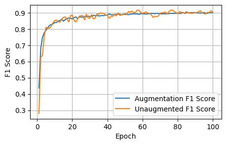 plot_metrics(aug_f1_scores, unaug_f1_scores, 'F1 Score')Plot the resultant metrics for the training of the model on augmented data